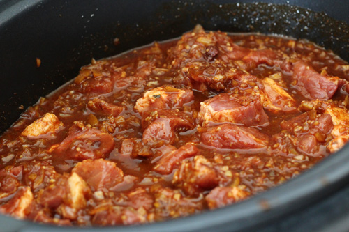 - Pour over the pork cubes and toss to coat well.