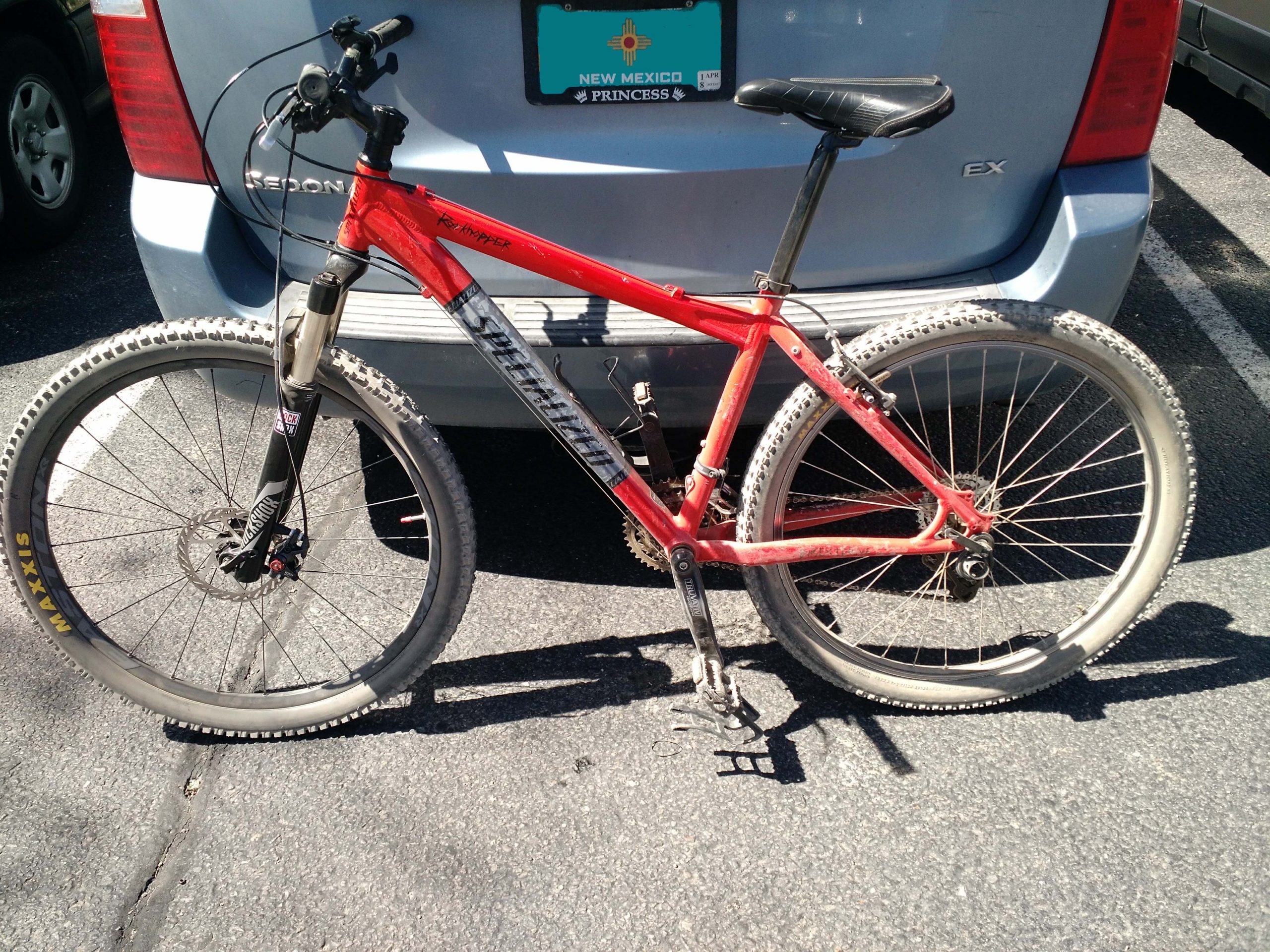 Dad enjoys riding amateurly around in the foothills of the Sandia Mountains. The trails are close to home and it keeps dad somewhat in shape. Though the frame is now old, dad upgraded most of the big parts. The crank, front fork, and wheels have been swapped out to better stuff and dad has continued plans to upgrade to 2×10 later in life.