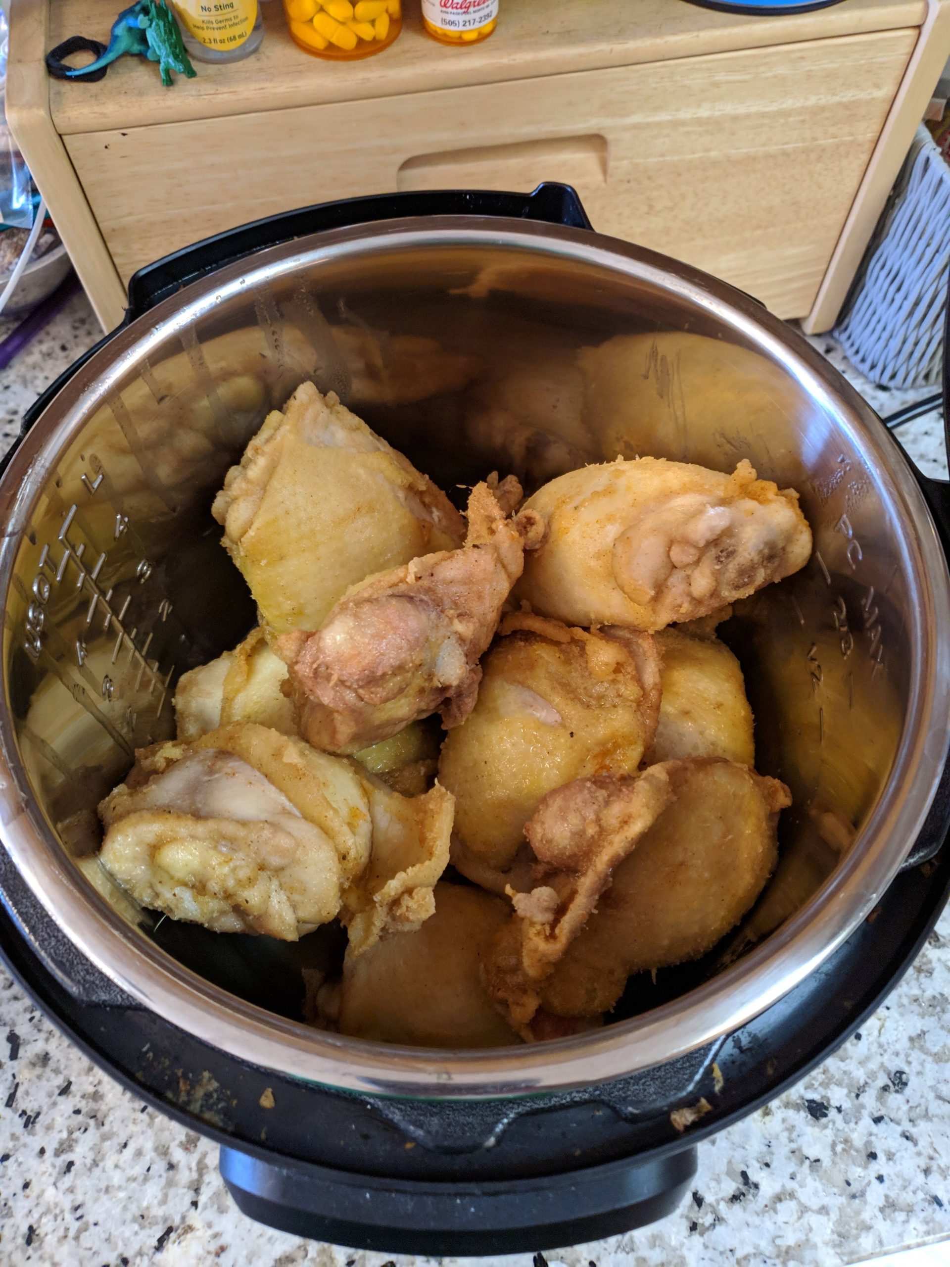 - Brush oil on chicken pieces and place in instant pot, first the dark meat then the breasts.