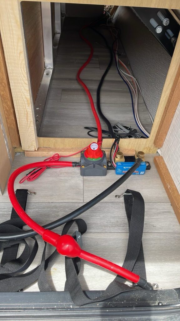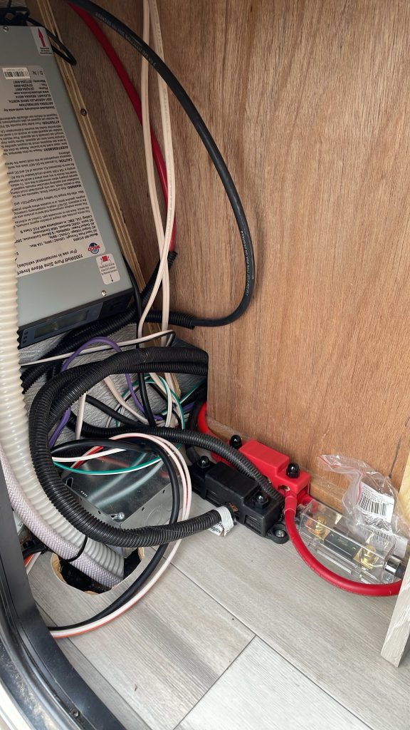Dad put the battery on the curbside passthrough storage as it had more space. He originally thought he was gonna put buses on this side but instead used the battery disconnect and the battery shunt as points to connect multiple cables.
