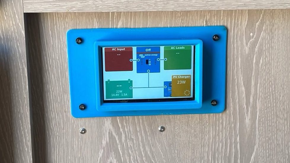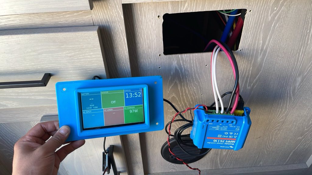 The trailer came with a GoPower 30A PWM solar controller, however when Dad chose to use the Victron ecosystem for the battery shunt, it was destined to be replaced. Dad wanted a system that can accurately determine SOC for lithium batteries and the Victron shunt was highly praised. That resulted into buying a solar charger that can communicate with it. Dad decided to use the 75v/10a charger, since the roof only has a 200w panel. It is a max power point tracking charger, which is more efficient for lower watt input and combined with the VenusOS, what you are seeing in the picture above, you can control everything from the touchscreen Dad built.
