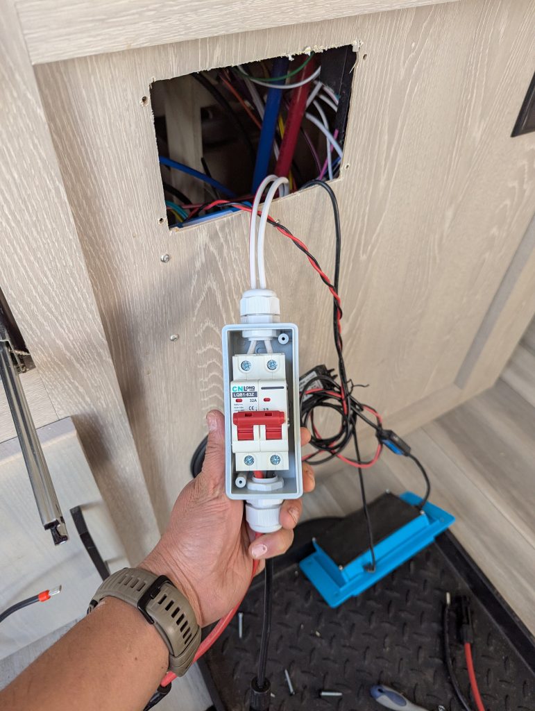 Prior to winterizing the TT, Dad wanted to isolate the solar panels so the electronics aren’t being powered by the panels intermittently. He installed 30A breakers to protect the 10awg wiring.