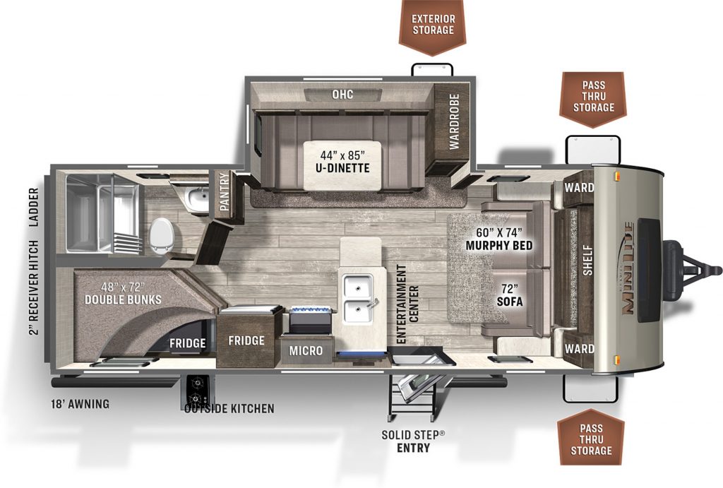 This trailer did not miss a detail; Dad was ecstatic. It was short for having bunks yet it had a palatial interior. Each bed can sleep 2, totaling 8. The galley has all the appliances and since this was a 12v only fridge, Forest River maximized how much food can be carried plus no leveling or temperature sensitivity. There is a double sink which is nice to conserve water. The bathroom is well thought-out, functional and the shower tub looks well glued to the walls. There are plenty of seating around the u-dinette and two or three on the sofa. Every possible place there could be a cabinet, Forest River installed one. There are cabinets over the dinette and there’s a pantry and a wardrobe.